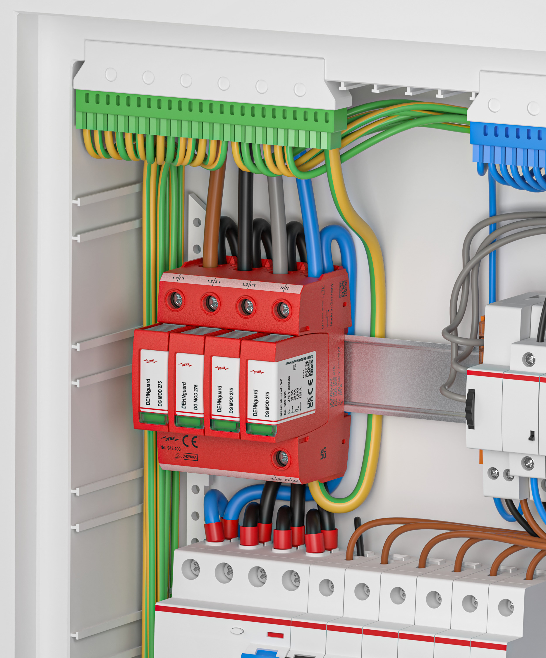 The DEHNguard MD has also proven itself in power distribution and switchgear cabinet building, as it meets strict requirements for current-carrying capacity and safety. Areas such as building automation and critical infrastructure also benefit from integrated double screw technology, as it enables durable and low-maintenance connections. In building technology, a supply cable with a cross-section of 16 mm² can now also be easily connected to the device using feed-through wiring.