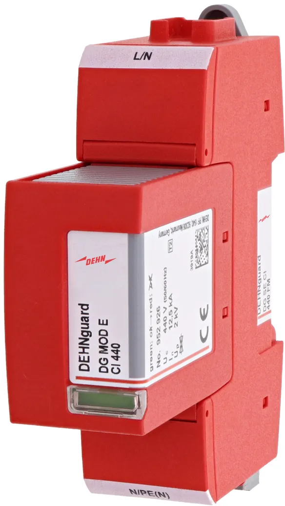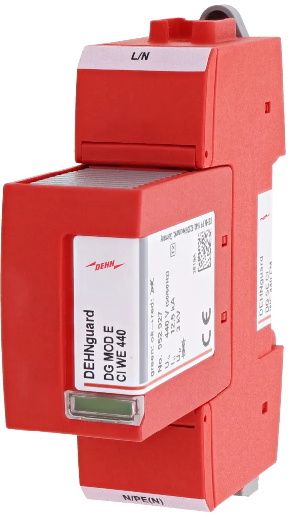 Descargador de sobretensiones unipolar y modular con la tensión del varistor asignada Umov = 750 V AC, compuesto por una base y un módulo de protección enchufable; con fusible previo integrado y contacto de señalización remota para el dispositivo de vigilancia (contacto conmutado libre de potencial).