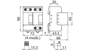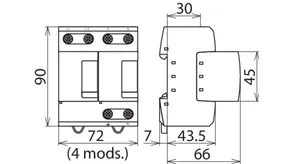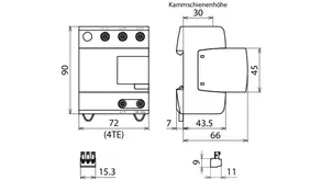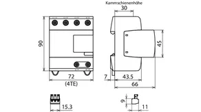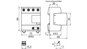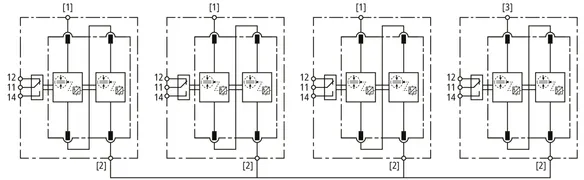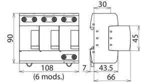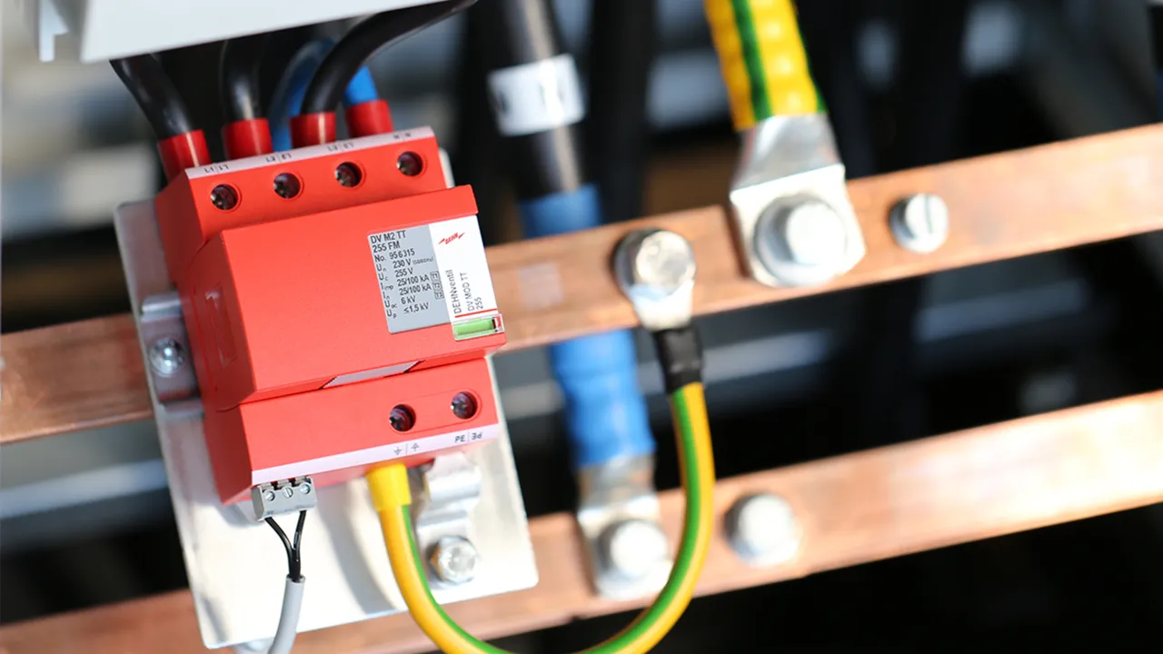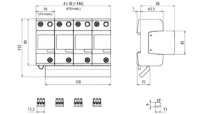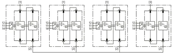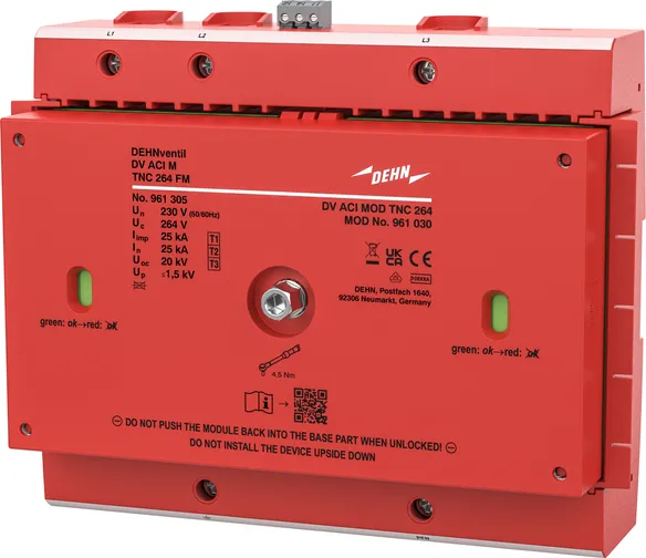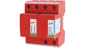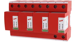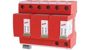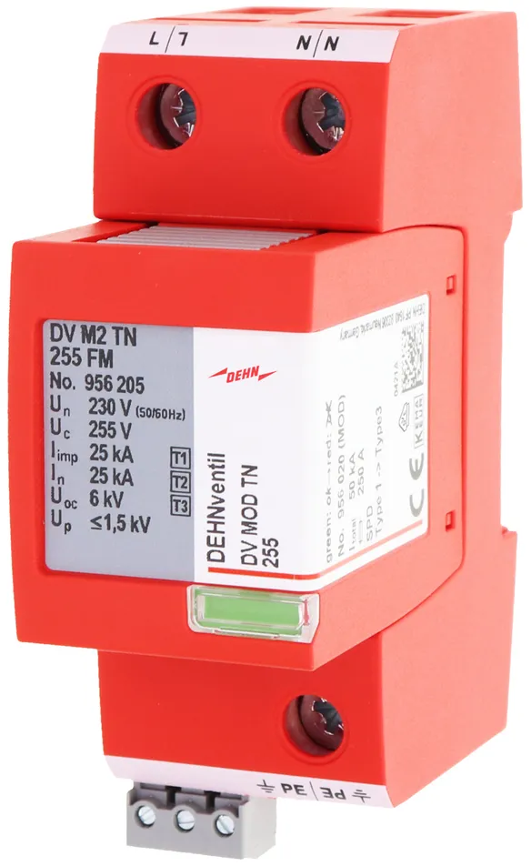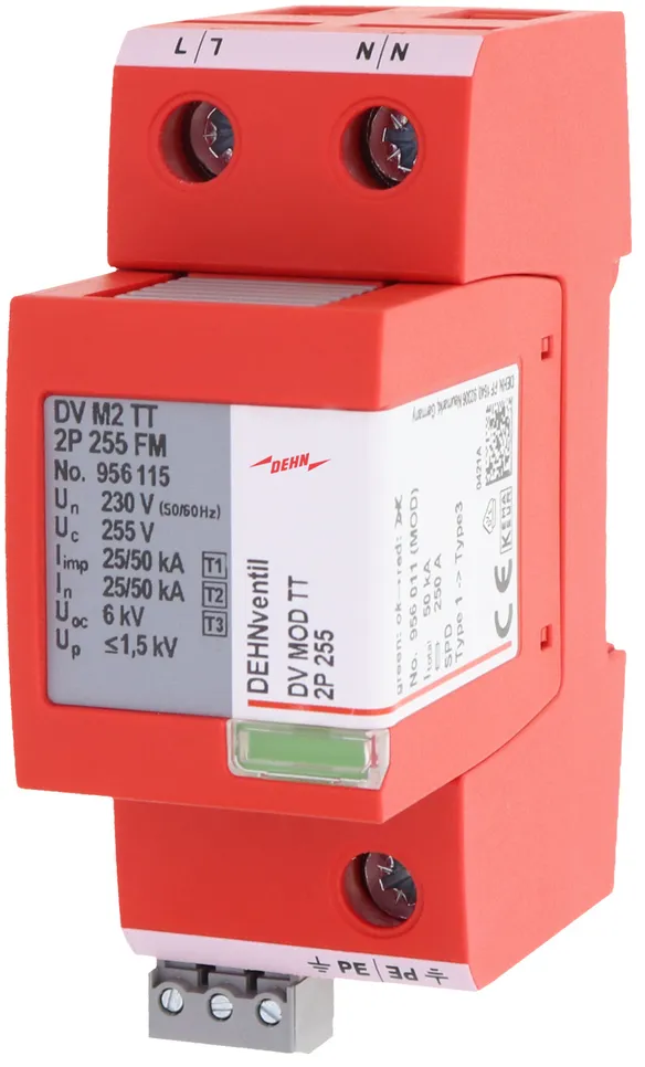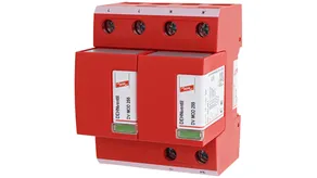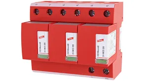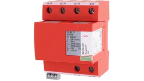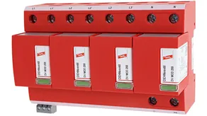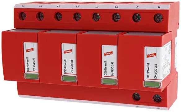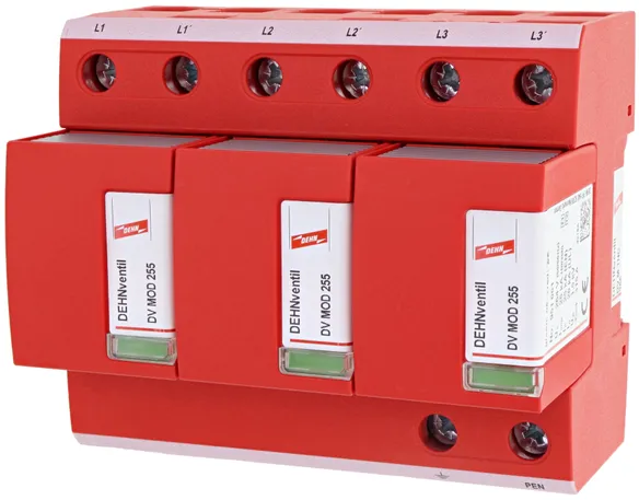 - Descargador combinado precableado Tipo 1 + Tipo 2 + Tipo 3 basado en vías de chispas, consistiendo en base y un módulo de protección enchufable individual