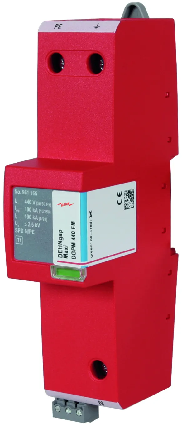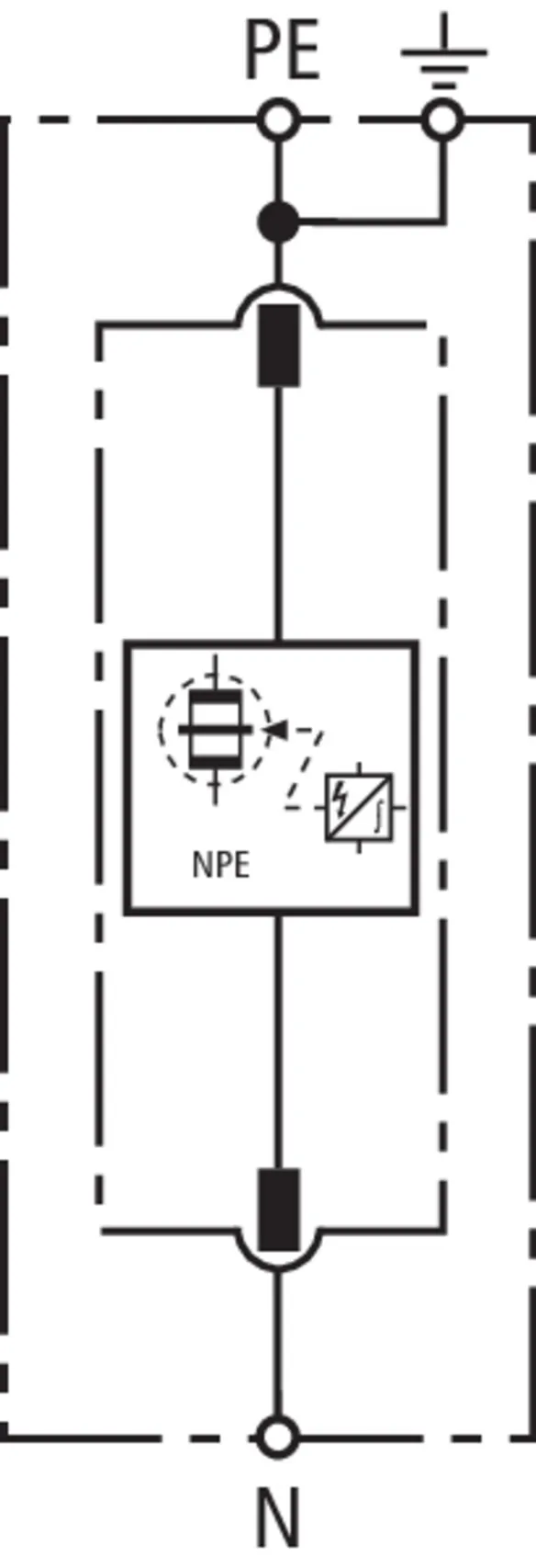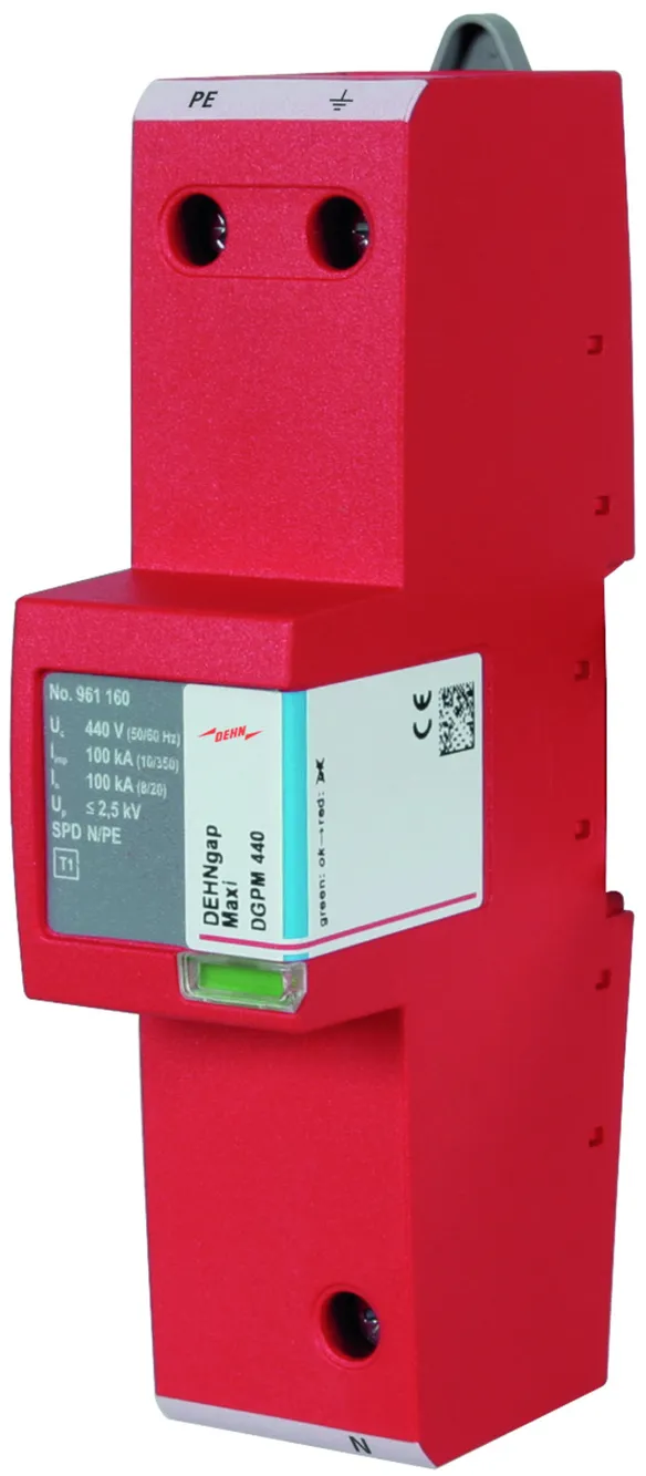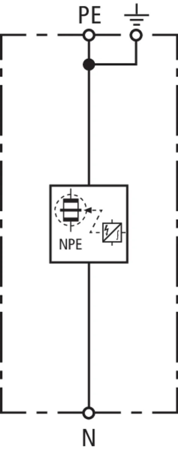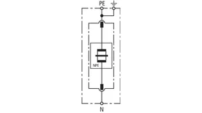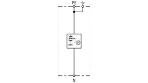 - Descargador de corriente total, especial para aplicación en sistemas TT, con circuitos 3+1 y 1+1 según IEC 60364-5-53, entre el conductor neutro N y el conductor de protección PE