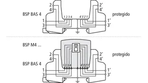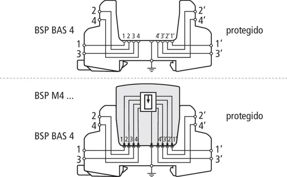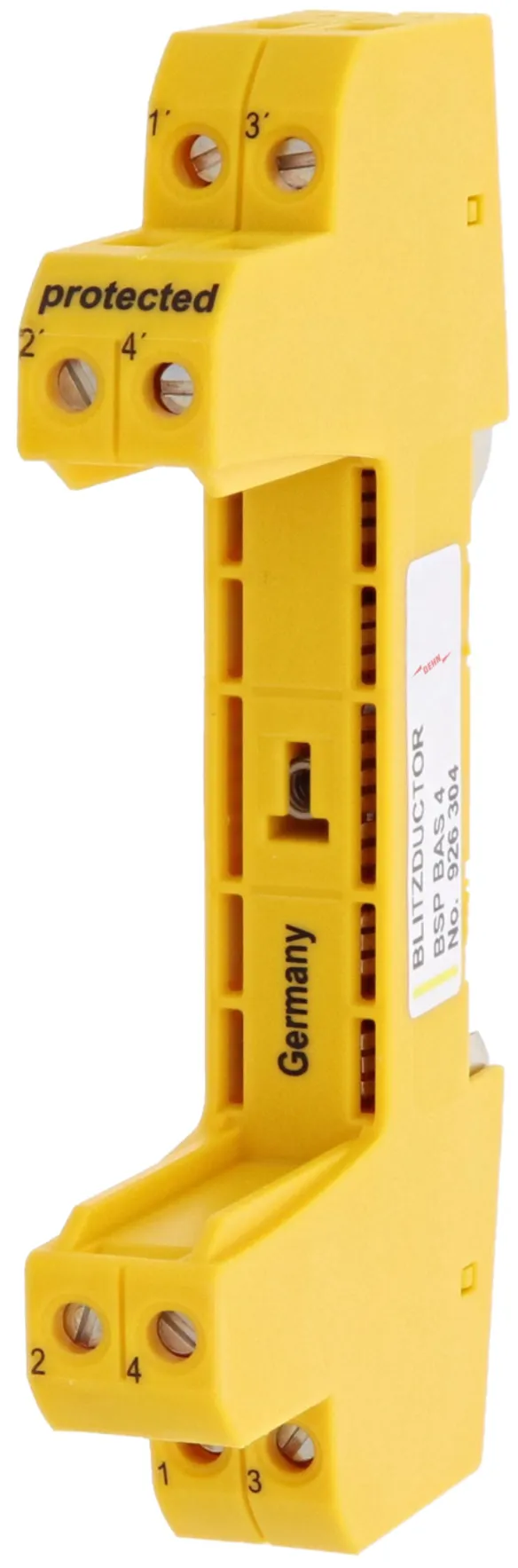 La base del BLITZDUCTOR SP de cuatro polos es una borna de conexión universal para inserción de módulos de protección, con interrupción de la señal no estando enchufado el módulo. El mecanismo de fijación de la base permite que el módulo de protección se conecte a tierra de manera segura a través del carril DIN. Como en la base no se incluye ningún elemento del circuito de protección, los trabajos de mantenimiento quedan limitados a los que eventualmente se realicen en los módulos de protección.