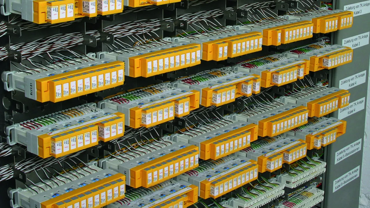 Descagador modular que consta del bastidor con los descargadores de gas, el carril de protección de puesta a tierra y los módulos de protección específicos para cada hilo.