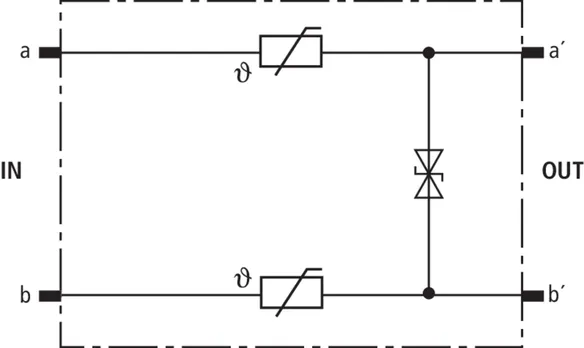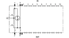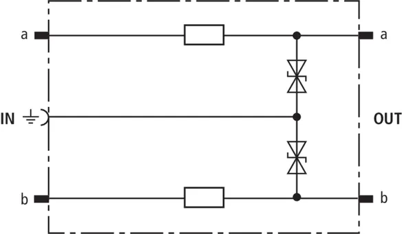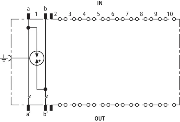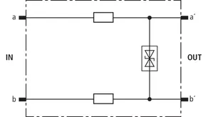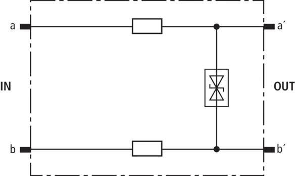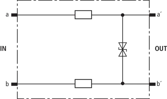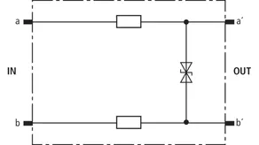 Elemento de protección enchufable 1 DA coordinado energéticamente con el dispositivo enchufable DRL, para protección de equipos finales en una sola etapa, con impedancias de desacoplo. Apropiado especialmente para circuitos de señal con potencial común. Toma de tierra a través de EF 10 DRL. Sólo para regletas de separación o para dispositivo enchufable DRL.