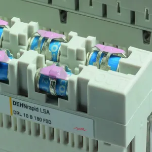 Regleta de protección DRL 10 DA, capaz de soportar corrientes de rayo, para prácticamente todas las aplicaciones, ampliable con clavija enchufable de protección DRL a descargador combinado. Los contactos de separación integrados en la regleta, permiten la verificación, medición y adaptación de los hilos objeto de protección, incluso estando insertado de descargador. Los descargadores de gas disponen de una función Fail-Safe con indicación óptica en caso de fallo.