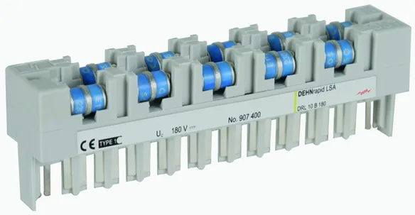 Regleta de protección DRL 10 DA, capaz de soportar corrientes de rayo, para prácticamente todas las aplicaciones, ampliable con clavija enchufable de protección DRL a descargador combinado. Los contactos de separación integrados en la regleta, permiten la verificación, medición y adaptación de los hilos objeto de protección, incluso estando insertado el descargador.