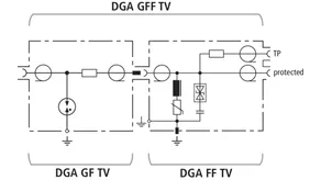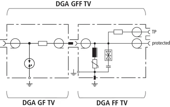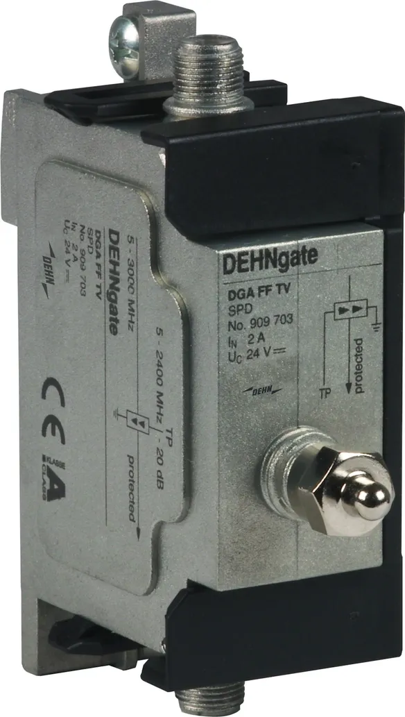 Los DGA … TV son descargadores con posibilidad de alimentación a distancia con conexión –F para instalaciones SAT y BK de 75 Ω. Los descargadores cumplen con los elevados requisitos del blindaje de Clase A según EN 50083-2. Apropiados para instalación, con ahorro de espacio, en todas las aplicaciones más usuales de TV y SAT. Los descargadores están disponibles, tanto como descargadores de corriente de rayo, como descargadores de sobretensiones, o bien como set de descargadores combinados con salida de medida integrada para verificación y comprobación de la instalación.