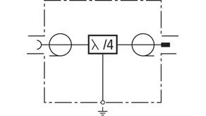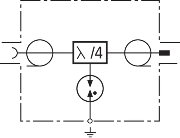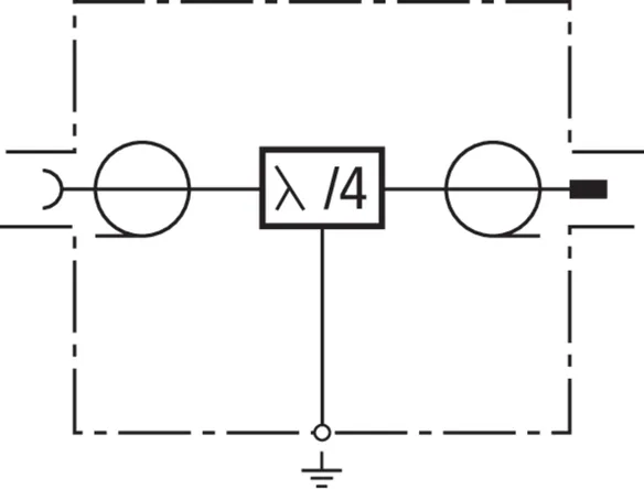 Descargador combinado en técnica Lambda/4, libre de mantenimiento para aplicaciones de multifrecuencia (Sistema multicarrier). Pueden descargar elevadas corrientes parciales de rayo. No es posible la alimentación a distancia, ya que el descargador constituye un cortocircuito galvánico para señales de baja frecuencia. De banda ancha para todos los servicios 4+3G y LTE.