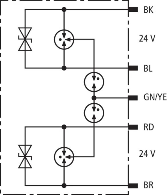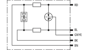 Descargador de sobretensiones de dos etapas, coordinado energéticamente, con circuito de protección de baja capacidad para protección de circuitos de medida con seguridad intrínseca y sistemas de bus. Cumple con requerimientos FISCO. Resistencia de aislamiento > 500 V a tierra. Los racores de cables deben solicitarse por separado.