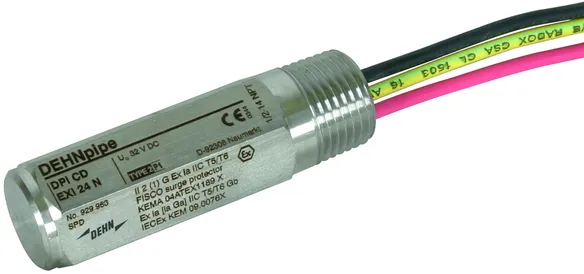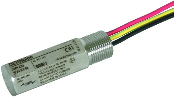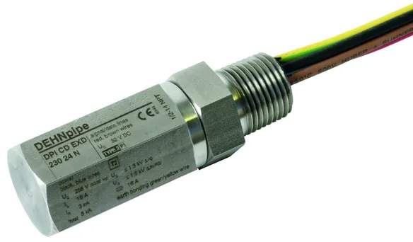 Descargador de sobretensiones antideflagrante para la protección del suministro de energía 120/230 V e interfaces de datos a 24 V de equipos de campo situados en atmosferas potencialmente explosivas (zonas 1 y 2).