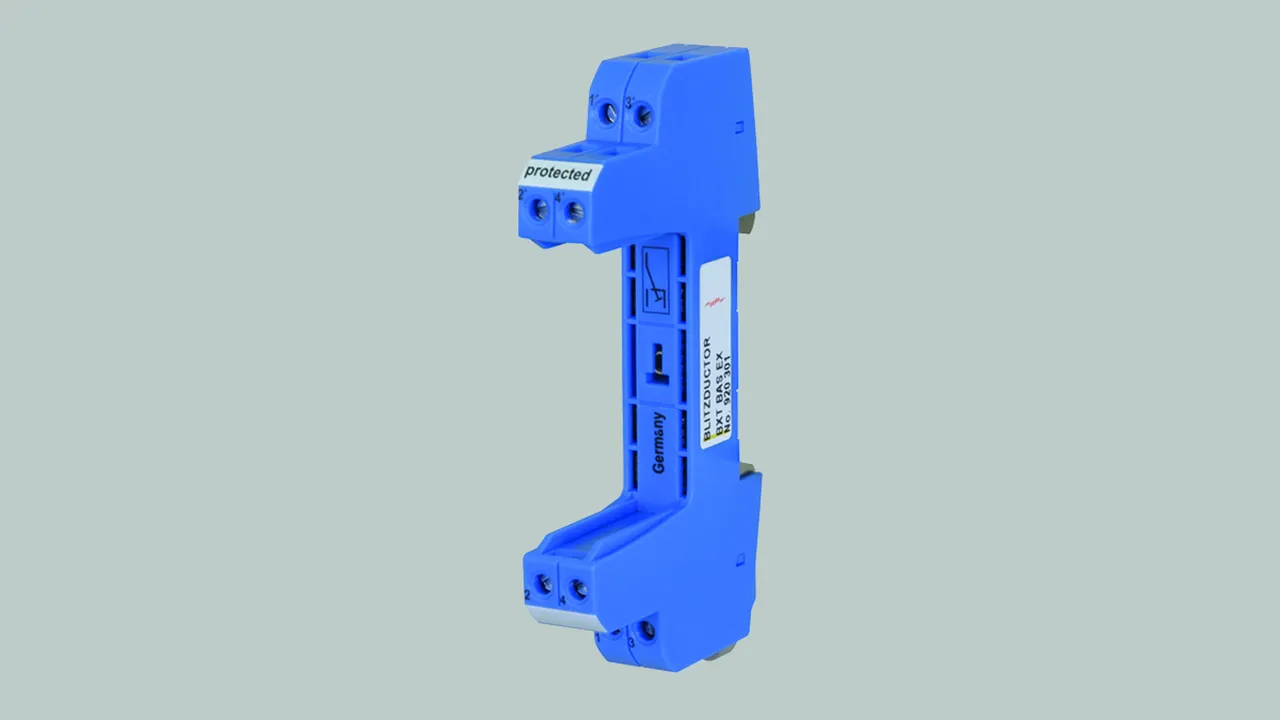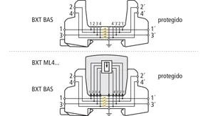 La base del BLITZDUCTOR XT es una borna de paso tetrapolar, universal para circuitos autoprotegidos, de gran economía de espacio, para inserción de los módulos de protección sin interrupción de la señal no estando enchufado el módulo. La toma de segura del módulo de protección se efectúa a través del carril DIN. Como en la etapa de base no se incluye ningún elemento constructivo del circuito de protección, los trabajos de mantenimiento quedan limitados a los que eventualmente se realicen en los módulos de protección.