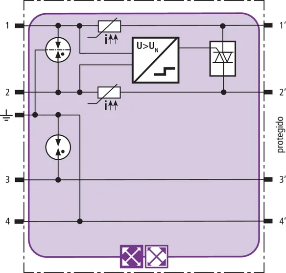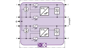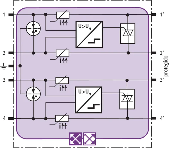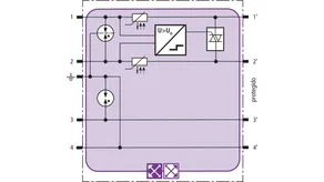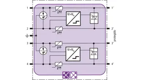 Módulo de protección combinado contra rayos y sobretensiones con tecnología actiVsense y LifeCheck RFID para la protección de dos pares de hilos de interfaces simétricas separadas galvánicamente con igual tensión de servicio o diferente. Detecta automáticamente la tensión de funcionamiento de la señal y ajusta de manera óptima la tensión del nivel de protección.