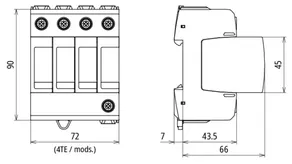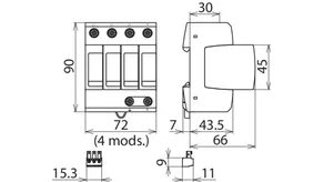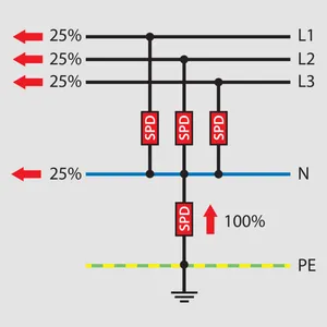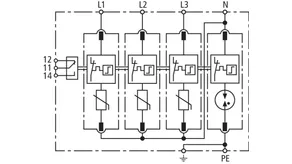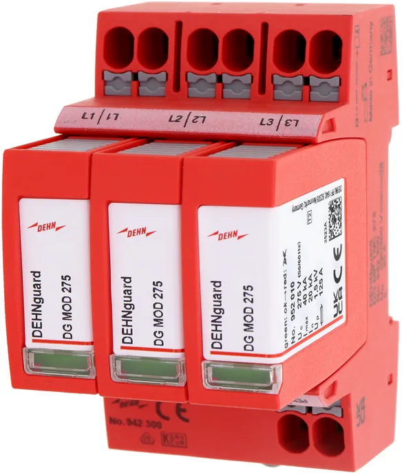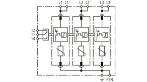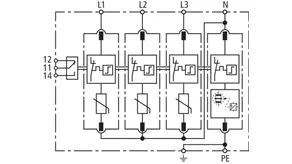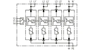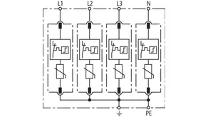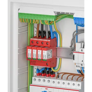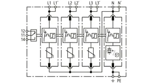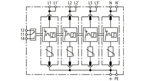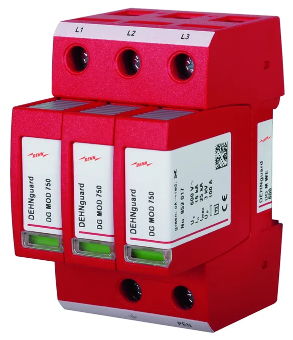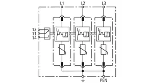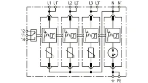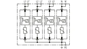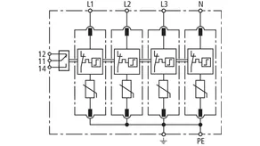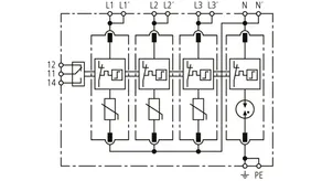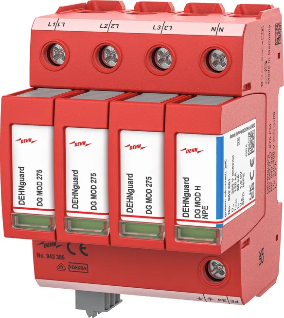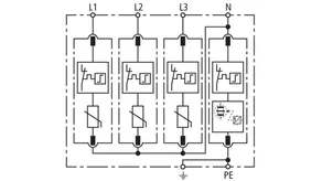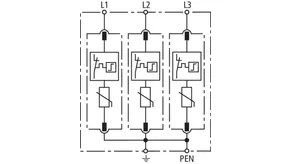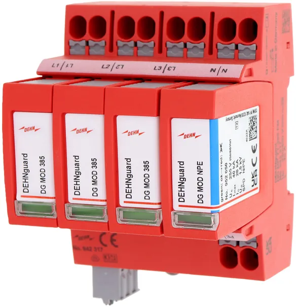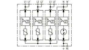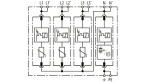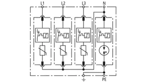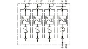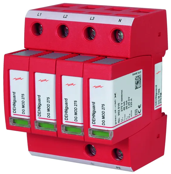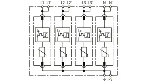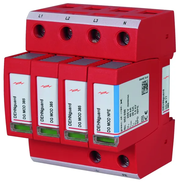 Descargador modular de sobretensiones con alta capacidad de descarga de suma en el circuito N-PE para sistemas TT y TN-S (circuito 3+1). Cumple los requerimientos elevados de seguridad según DIN VDE 0100-534 para su utilización en el punto de alimentación de la instalación eléctrica; con contacto de señalización a distancia libre de potencial.