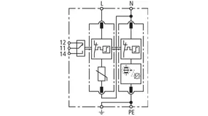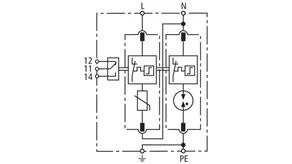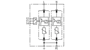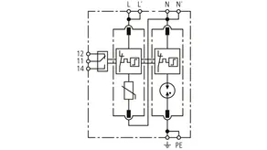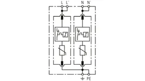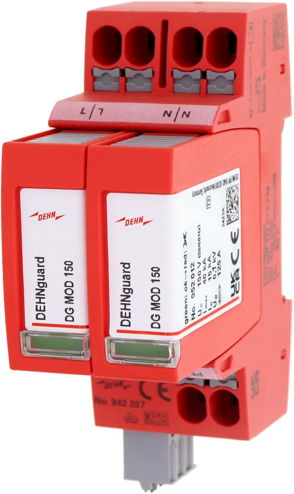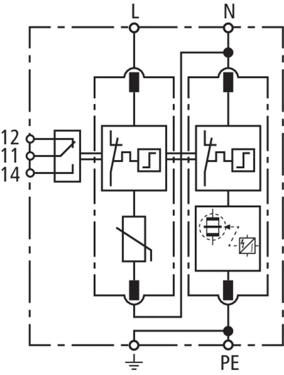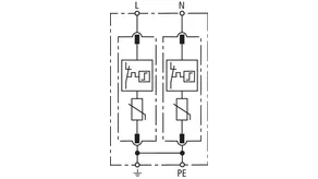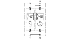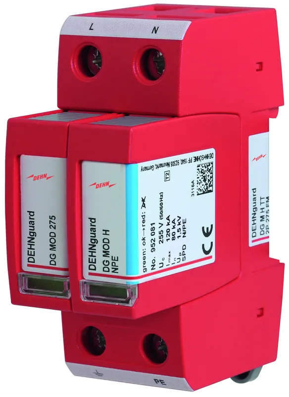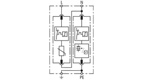Descargador modular de sobretensiones con alta capacidad de descarga de suma en el circuito N-PE para sistemas TT y TN-S (circuito 1+1). Cumple los requerimientos elevados de seguridad según DIN VDE 0100-534 para su utilización en el punto de alimentación de la instalación eléctrica; con contacto de señalización a distancia libre de potencial.