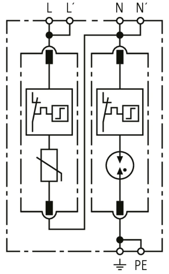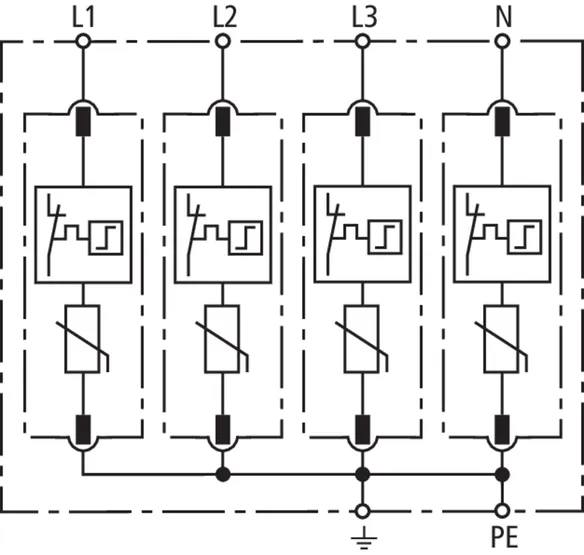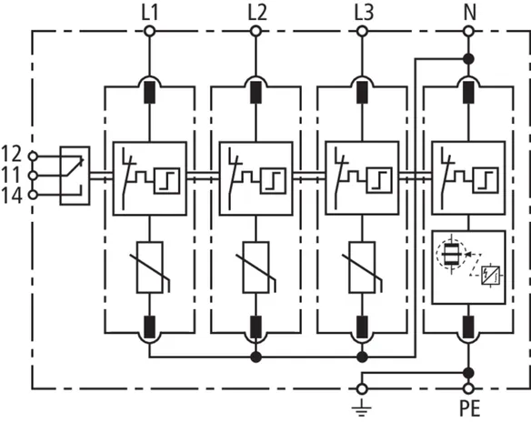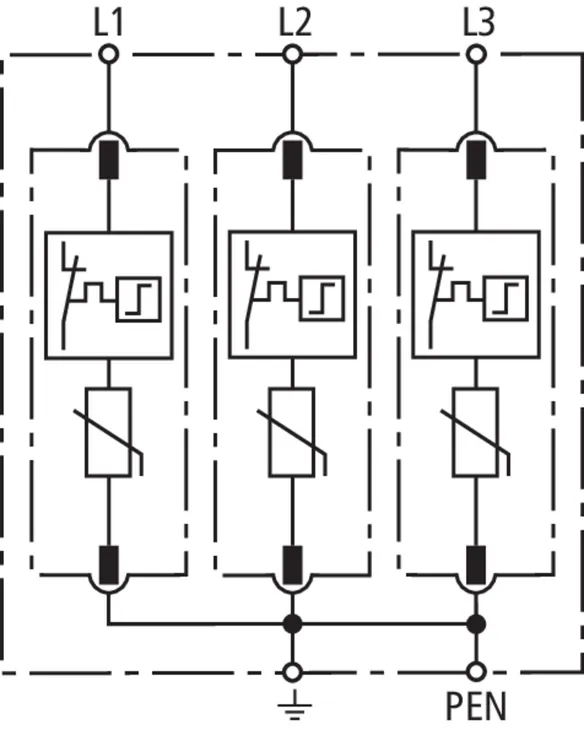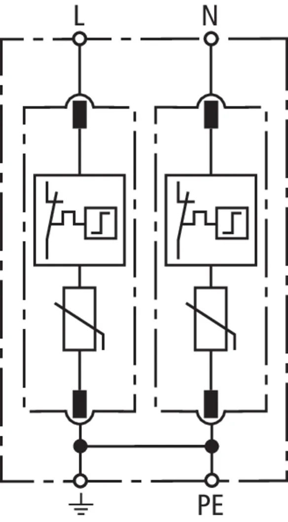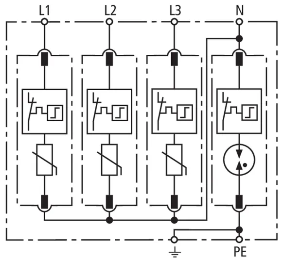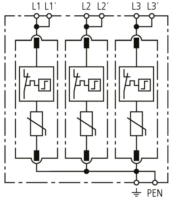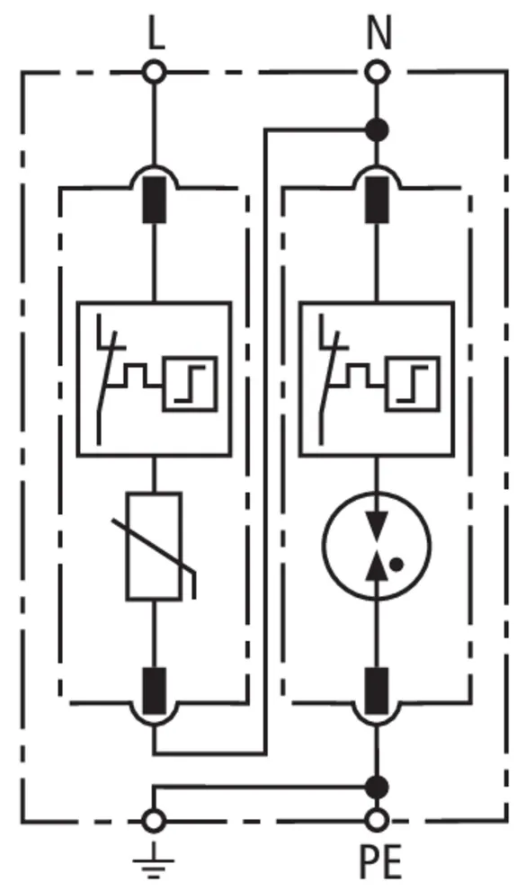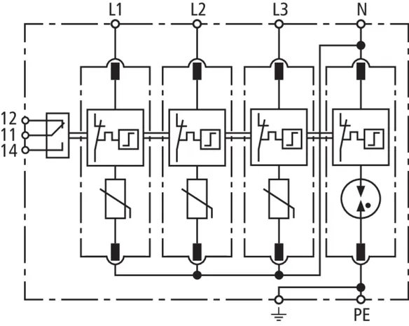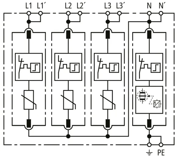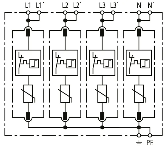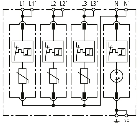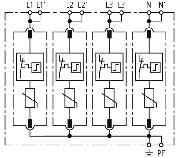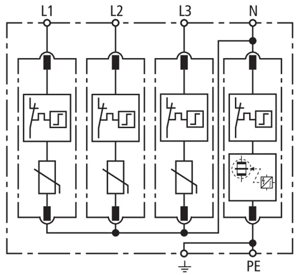 - Elevada capacidad de derivación gracias a los potentes varistores de óxido de zinc/vías de chispas