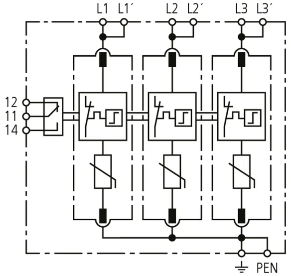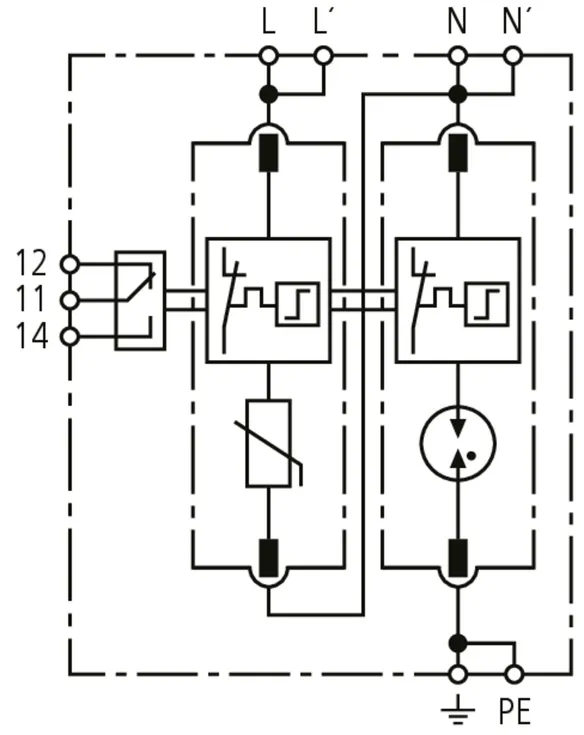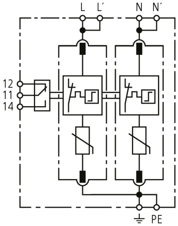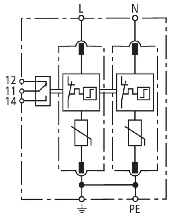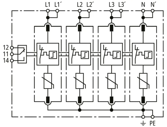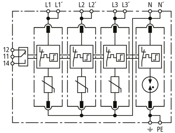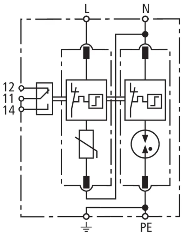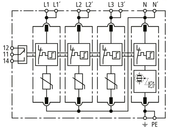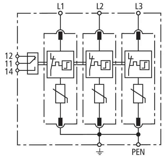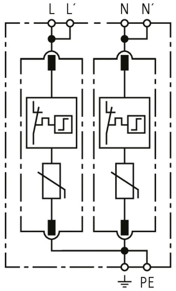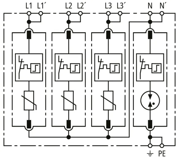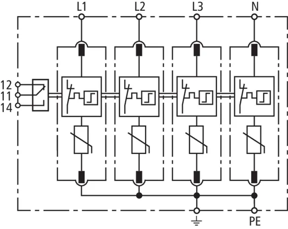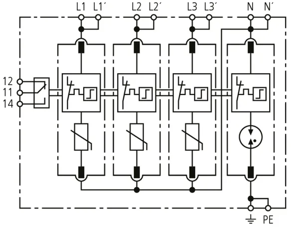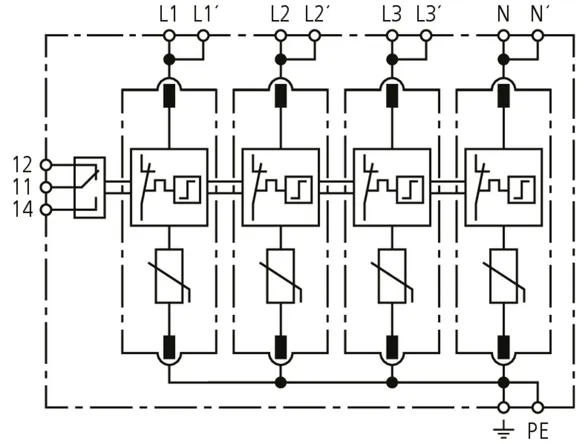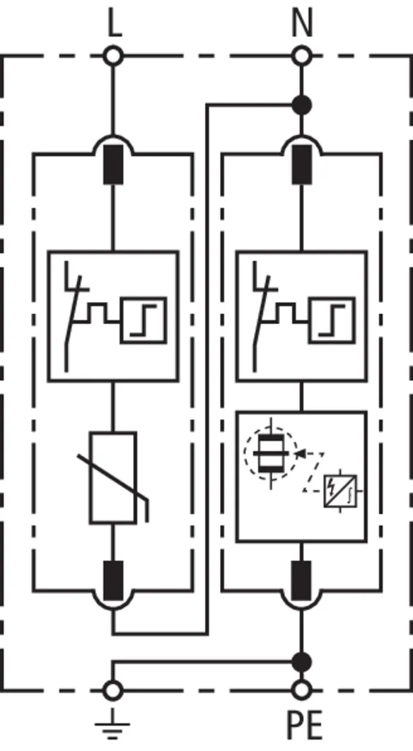- Elevada capacidad de derivación gracias a los potentes varistores de óxido de zinc/vías de chispas