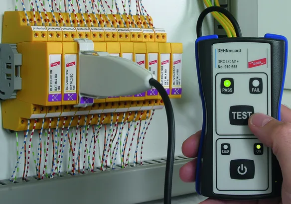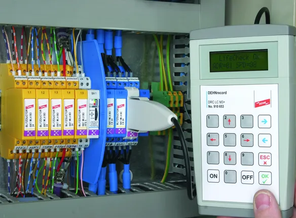 Equipo portátil con sensor LifeCheck RFID para utilización flexible. Para la comprobación rápida y sencilla de los descargadores equipados con LifeCheck RFID. Equipado con indicador óptico y acústico. Además, está equipado con una conexión USB y software de base de datos para PC, para la gestión de los dispositivos a comprobar y la documentación de los resultados de las pruebas con ayuda de un PC. El DRC LC M3+ está equipado con un sensor LifeCheck RFID con función de enclavado. Este equipo de mano apoya también la parametrización de los descargadores para la monitorización de estado operativo.