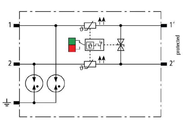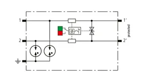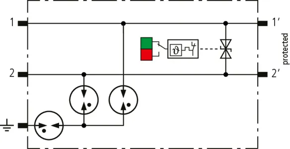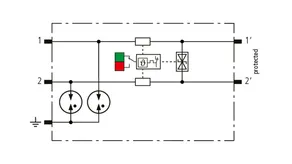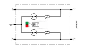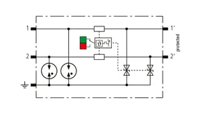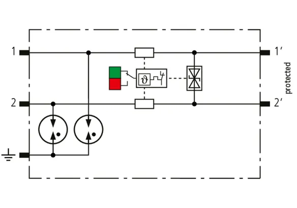 Descargador combinado de corrientes de rayo y sobretensiones modular, con ahorro de espacio, con 6 mm de ancho y técnica de conexión Push-in con indicación del estado operativo para la protección de un par de hilos en sistemas 24 V dc. Para su utilización también en caso del polo negativo puesto a tierra. Los resistores PTC integrados permiten una repuesta segura del descargador después de una interferencia en el circuito de la instalación con corrientes de cortocircuito hasta 40 A. Con interrupción de la señal para trabajos de mantenimiento.