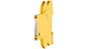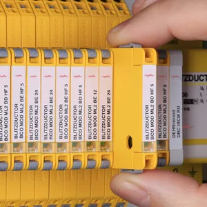 Descargador de sobretensiones modular, que ahorra espacio con un ancho de solo 6 mm y técnica de conexión Push-in con indicación del estado operativo para la protección de 2 hilos de interfaces de señal multifilares libres de potencial de tierra con una tensión nominal de 230 V. Con interrupción de la señal para fines de mantenimiento. Cumple, entre otros, los requerimientos a sistemas de señalización en la industria ferroviaria (conforme a DB RIL 819.0808).