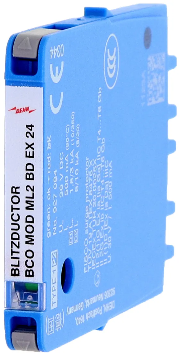 Módulo de protección de descargadores combinados de corrientes de rayo y sobretensiones, 6 mm de ancho para el BLITZDUCTORconnect con indicación del estado operativo para la protección de 1 par de hilos de circuitos de medida autoprotegidos y sistemas bus. Cumple los requerimientos según FISCO. Resistencia de aislamiento >500 V hilo-tierra.