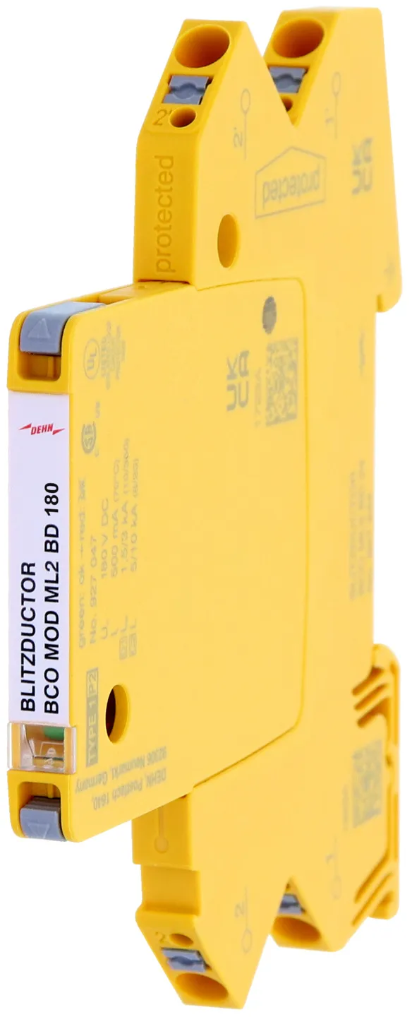 Módulo de protección y descargador de sobretensiones con un ancho de 6 mm para el BLITZDUCTORconnect con un indicador del estado operativo para la protección de 2 hilos de interfaces de señal multifilares libres de potencial de tierra con una tensión nominal de 230 V. Cumple, entre otros, los requerimientos a sistemas de señalización en la industria ferroviaria (conforme a DB RIL 819.0808).