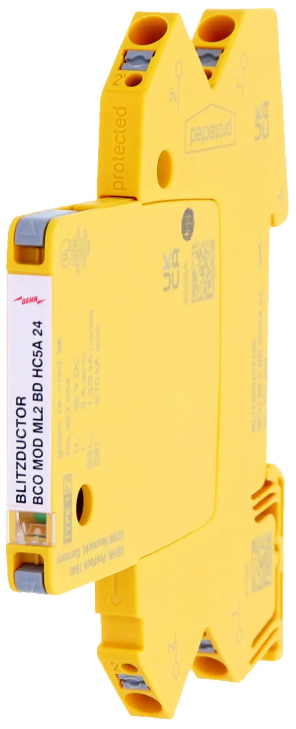 Módulo de descargador combinado de corrientes de rayo y sobretensiones con 6 mm de ancho para el BLITZDUCTORconnect con indicación del estado operativo para la protección de un par de hilos en sistemas 24 V dc. Para su utilización también en caso del polo negativo puesto a tierra. Los resistores PTC integrados permiten una repuesta segura del descargador después de una interferencia en el circuito de la instalación con corrientes de cortocircuito hasta 40 A.
