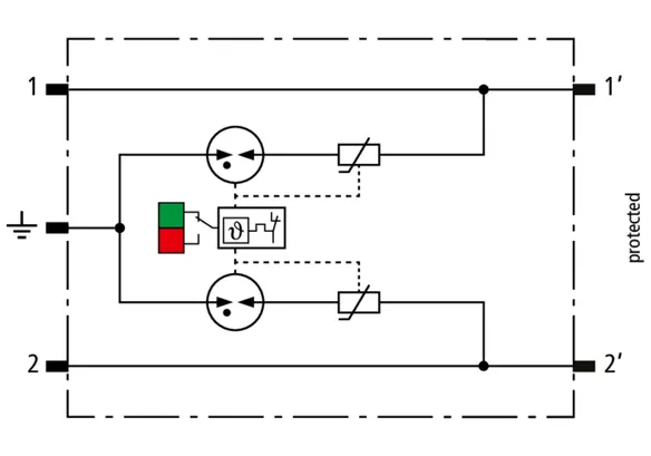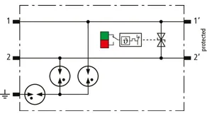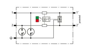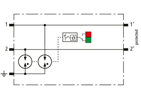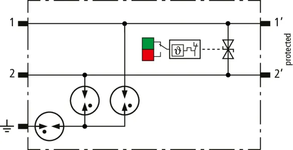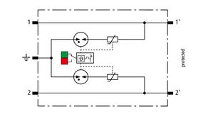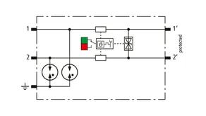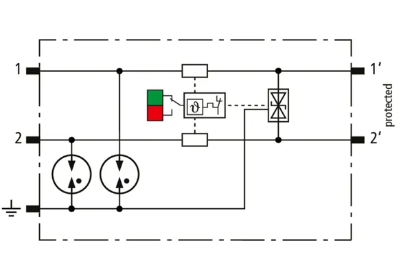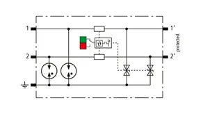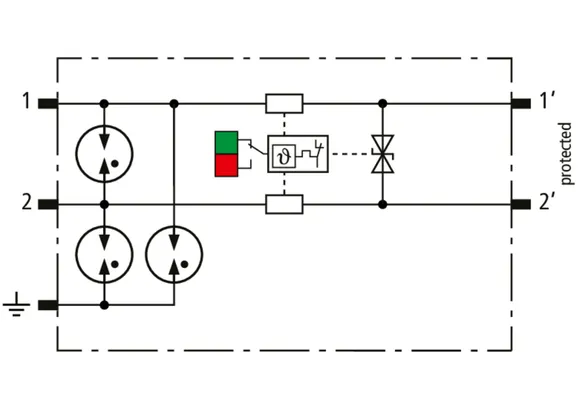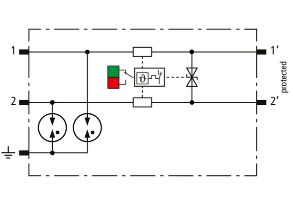 Descargador combinado de corrientes de rayo y sobretensiones modular, con ahorro de espacio, con 6 mm de ancho y técnica de conexión Push-in con indicación del estado operativo para la protección de un par de hilos en sistemas 24 V dc. Para su utilización también en caso del polo negativo puesto a tierra. Los resistores PTC integrados permiten una repuesta segura del descargador después de una interferencia en el circuito de la instalación con corrientes de cortocircuito hasta 40 A. Con interrupción de la señal para trabajos de mantenimiento.