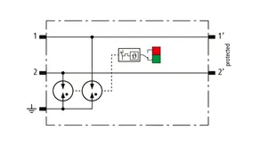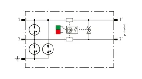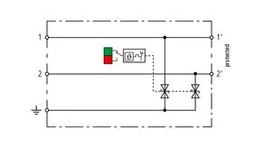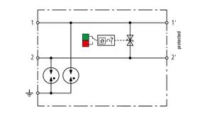 Descargador combinado de corriente de rayo y sobretensiones de espacio reducido de 12 mm de ancho y tecnología de conexión Push-in con indicación de estado para la protección de 1 par de hilos de sistemas de alimentación de CC sin referencia a tierra para redes de transmisión de datos y circuitos de medición y control.