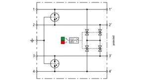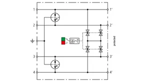 Descargador combinado de corriente de rayo y sobretensiones de espacio reducido de 12 mm de ancho y tecnología de conexión Push-in con indicación de estado para la protección circuitos de medida de 4 conductores sin referencia a tierra de redes de transmisión de datos y técnica de medida y control.