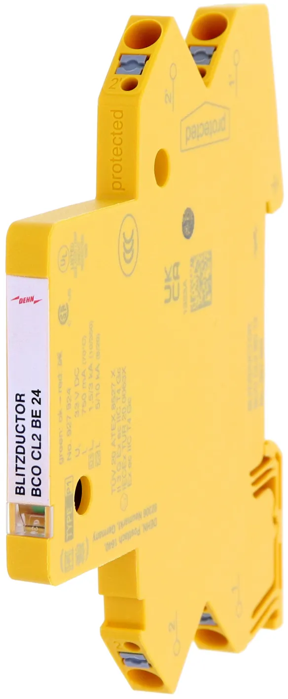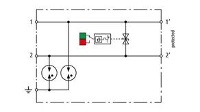 Descargador de sobretensiones compacto que ahorra espacio con un ancho de solo 6 mm y técnica de conexión Push-In con indicación del estado operativo. Protección fina contra sobretensiones en una sola etapa con potentes diodos, para la protección de 2 hilos individuales con potencial de referencia común, así como interfaces asimétricas.