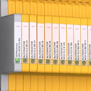 Descargador compacto combinado de corrientes de rayo y sobretensiones que ahorra espacio con un ancho de solo 6 mm y técnica de conexión Push-in con indicación del estado operativo para la protección de 2 hilos individuales de transmisiones radioeléctricas con potencial de referencia común así como interfaces asimétricas.