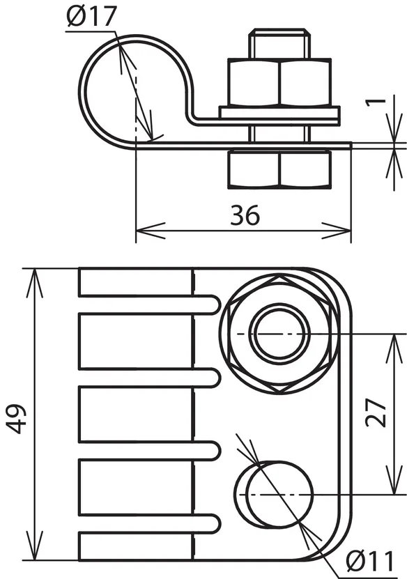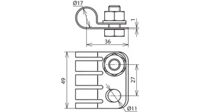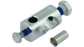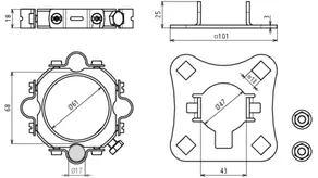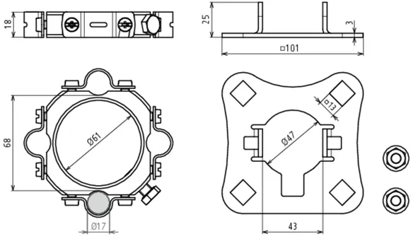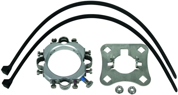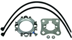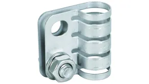 Set de fijación para el montaje del cable HVI light en un tubo autosoportado Ø50 mm (por ejemplo, tubo autosoportado HVI long); consta de placa de conexión (cuatro orificios, con dos tuercas de bloqueo) y anillo de fijación con cuatro soportes de conductores ranurados (Ø17 mm) para el rango de ajuste (incluye dos bridas de cable).