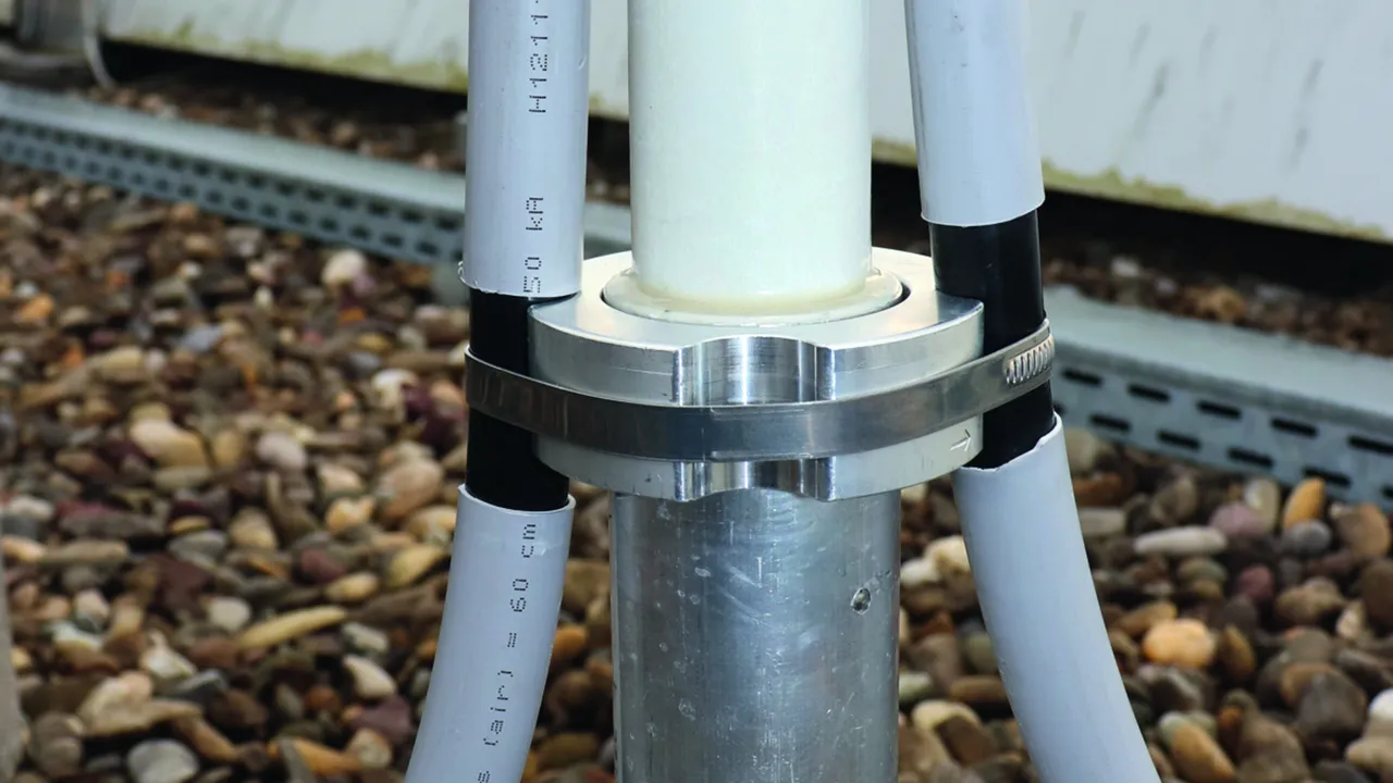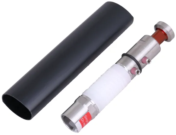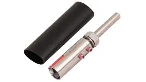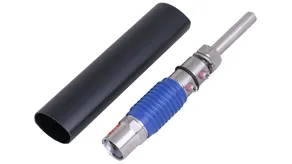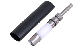 Un elemento de conexión como pieza de cabeza del cable HVI light plus, para realización de la conexión terminal del conductor en el tubo autosoportado (elemento terminal) o para conectar con otras partes de la protección externa contra rayos o con una instalación de toma de tierra (incluye un tubo termorretráctil).